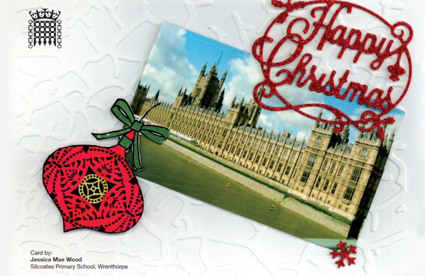 Jessica Mae’s winning entry combined a lovely photo of the Houses of Parliament with a bauble and an artistic Merry Christmas, overlaid on an embossed card. It will now be professionally printed and sent out across Morley and Outwood.