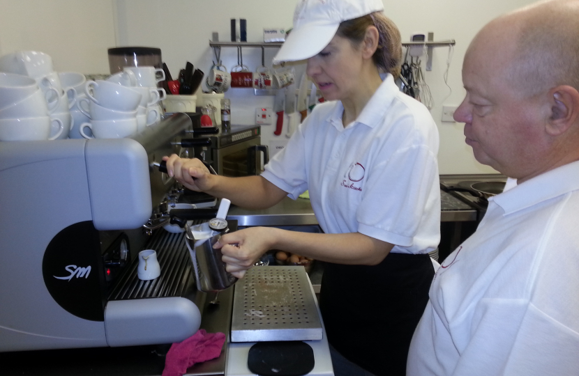 I arrived at Sues Kitchen and immediately I was kitted out in the uniform which compiled of; a hair net, baseball cap, white polo top and an apron.  They are very health and hygiene conscious.  I was shown how to use the coffee machine and learnt how to make Latte’s and Cappuccino’s. I served the customers and used their three minute dishwasher. Wow I wish I had one of those at home!  There were many regulars who visited the café and I was impressed by how well they cater for vegetarians.  In fact before I was selected to be the PPC; back in April I was conducting public surveys on Morley High Street and I visited Sue’s Kitchen and had a lovely bowl of their homemade Mushroom Soup.  It was very enjoyable and Sue, Ian and the team work extremely hard and produce good quality food.