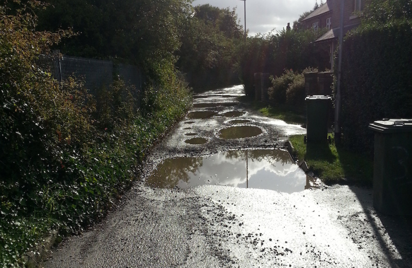 I was particularly concerned about the amount of potholes we encountered recently which do need addressing as some of there certainly are above the legal depth allowed.  I also have concerns and really feel for those who live in an area that has an un-adopted road.  The picture above shows the condition in which the residents live, one of which is an elderly lady who needs to drag her green bin to the bottom of the lane for the council to collect the refuse, it also proves to be a challenge for a young family who need to use their buggy.